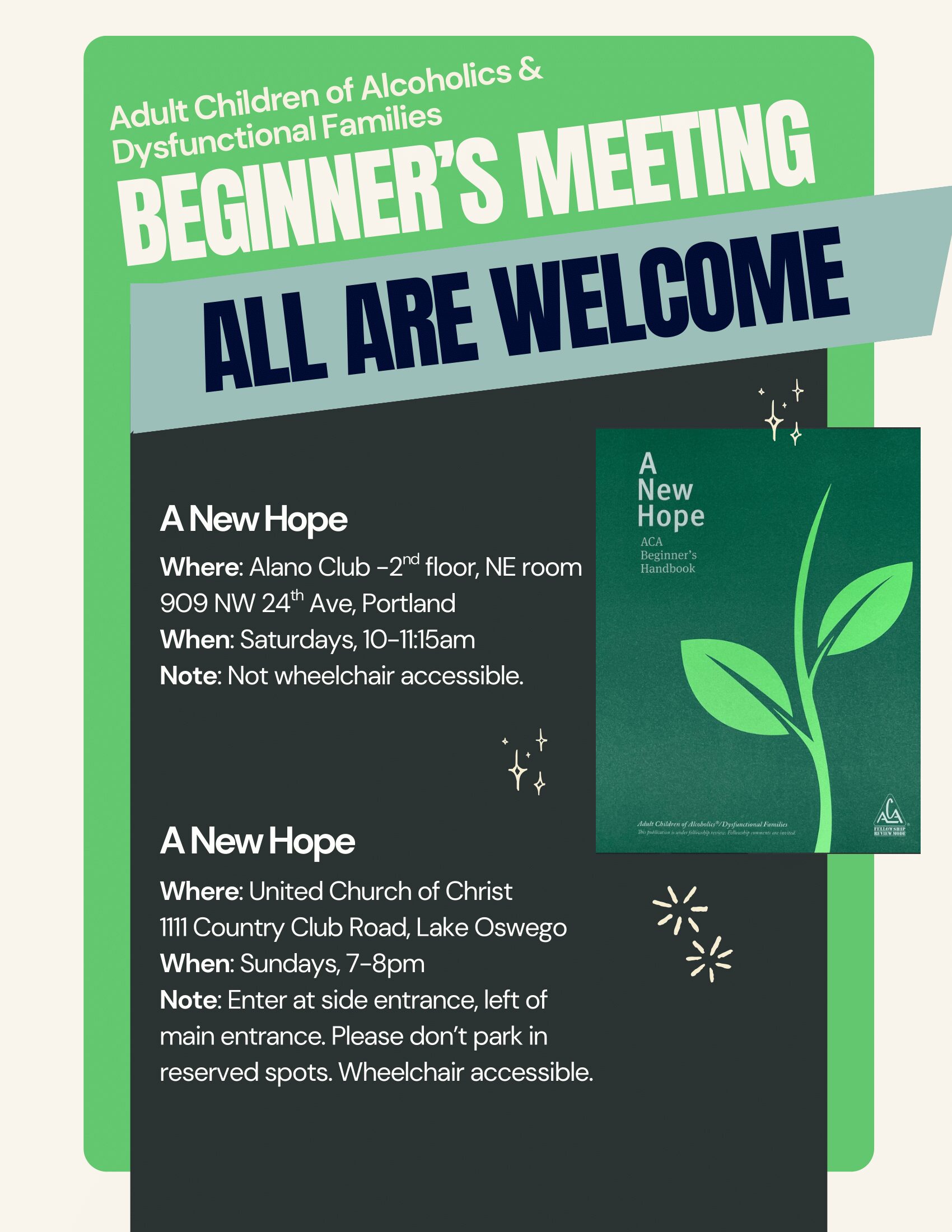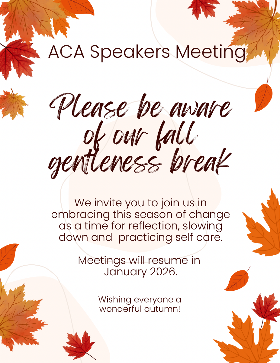 As ACA becomes a safe place for you, you will find freedom to express all the hurts and fears that you have kept inside and to free yourself from the shame and blame that are carry-overs from the past. ... < read more >
